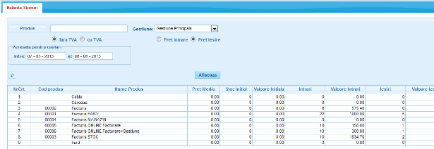 Daca se doreste balanta stocurilor pe o anumita perioada, selectati intervalul pentru care se doreste calcularea balantei dupa care apasati butonul Afiseaza.